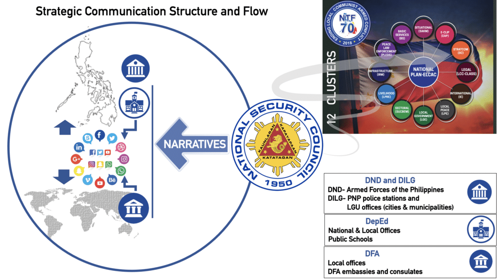 All local offices and units under the DILG and DND and DepEd offices and public schools take its CTG counterpropaganda and disinformation cue from the SCC; similarly, the DFA offices align its narrative with the NSC secretariat.